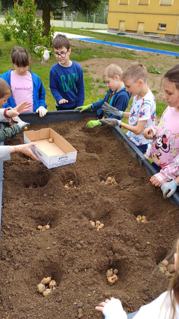 V hodině českého jazyka jsme pracovali v týmech a souhrnně jsme opakovali učivo 3.třídy-ze slov jsme složili souvětí a na něm jsme určovali, co všechno jsme se letos naučili. Venku jsme pak na vyvýšeném záhonu zasadili brambory, které jako vloni na podzim sklidíme a na uvařených si pochutnáme. V pergole jsme si stačili ještě poslechnout a ústně rozebrat příběh, který nám paní učitelka přečetla. Vkládali jsme i vlastní zkušenosti a postřehy. Dopolední výuka byla fakt pestrá ! (M.Macková)